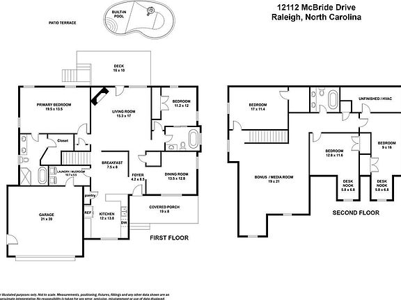 First Floor: Master Suite, Guest Bedroom w/Full Bath, Laundry/Mud Rm entry from garage, Dining Rm, Breakfast Nook, Kitchen, and Family Rm. Second Floor: Three more bedrooms, a full bath, and a large Bonus room. The back Deck overlooks the 9,000 gallon In-Ground Salt Water Pool. Fenced yard. Roof 2019. Ext. Paint 2019. HVAC 2016 and 2021. Tankless Water Heater 2018. Garage Floor Epoxy 2016. Pool 2017 (Thermal Blanket, Cleaning Crawler, And Furniture included) Great Schools, Great Access to I-540.