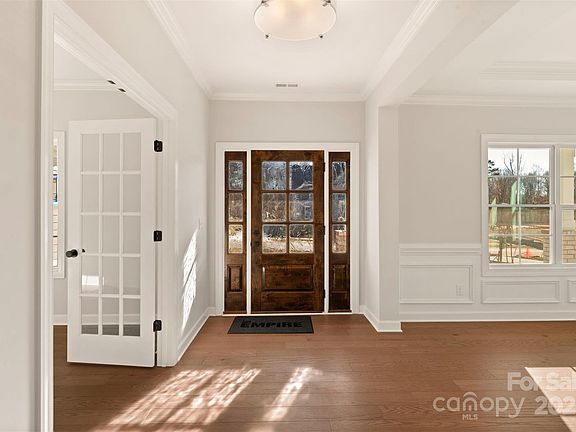 This Mint Hill home features a covered rear porch & is on a .48 acre cul-de-sac street lot, backing up to wooded common open space. 1st-floor guest suite & 2nd-floor Premier Suite. Off the foyer is a formal living & dining rm. Family rm has a centered gas fireplace flanked by 2 niches w/ cabinets. Gourmet kitchen w/ large pantry, quartz counters, 42" cabs w/ island, LED under-cabinet lights, soft close doors/drawers, SS GE Profile app w/ 36" gas cooktop & extraction hood plus wall oven & micro. Mudroom built-in drop zone. Upstairs is large Bonus rm. 2 bedrooms share a Jack & Jill bath, & 1 bedroom w/ private bath. Premier Suite w/ tray ceiling & sitting area, expansive WIC, & bathroom w/ tray ceiling, split vanities, large tiled shower w/ seat & soaking tub. All full baths include quartz counters and tiled floors. Hardwoods thru most of 1st floor. Stairs have oak treads & iron balusters.