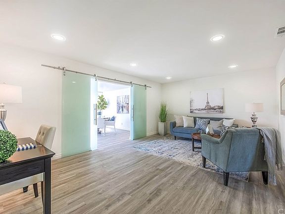 Beautiful Eastgate home in West Garden Grove. This home has been completely remodeled with contemporary design elements throughout. This bright and spacious home is situated on a large 6,500 s/f corner lot with a swimming pool. All the windows have been upgraded with double pane vinyl windows for energy efficiency. The large remodeled kitchen opens to the living room and the adjacent enclosed sun room that is separated by frosted glass barn doors that provides privacy while permitting light. The spacious kitchen had been remodeled with new white cabinets with soft close hinges, quartz countertop, all new stainless steel appliances, subway tile backsplash with decorative mosaic designs. The home also energy efficient with bright LED recessed lighting. This home is perfect for entertaining and is centrally located to award winning schools, shopping and freeway access.