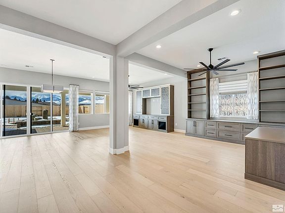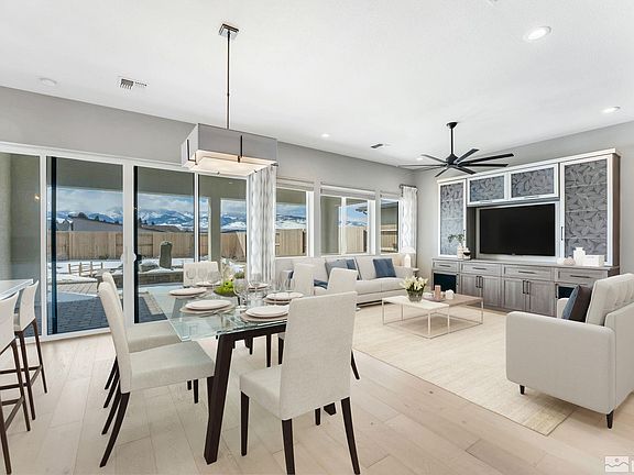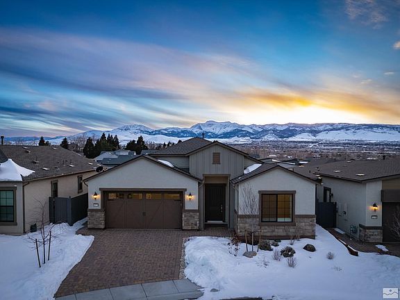 Welcome to your dream home in the beautiful 55+ gated community of Regency at Caramella Ranch. Breathtaking views of Mt. Rose and the Sierra Mountains can be enjoyed from nearly anywhere in this stunning home or from the comfort of your covered back patio, perfect for entertaining or simply relaxing. Inviting open floorplan of 1673sf with 2 bedrooms + office features gorgeous wood flooring & upgrades throughout. This home is truly one of a kind and ready for you to call it your own. Come see it today!, The stunning kitchen showcases white cabinetry, quartz countertops with glass tile backsplash, and black stainless steel appliances, creating a modern and sophisticated feel. The luxury primary suite is a true retreat, featuring a zero clearance shower with glass door and built-in closet organizer. More upgrades throughout the home include ceiling fans, motorized blinds, and epoxy finished garage floor ensuring maximum comfort and convenience. In addition to these fabulous features, this home is equipped with a whole house spring water system and whole house humidifier, for a comfortable year-round living environment. The low maintenance landscaping, complete with a serene water feature, adds to the peaceful ambiance of this property. Community amenities include the most incredible resort-style clubhouse with indoor & outdoor pools, fitness center, pickle ball, bocce ball, on-going events & activities, & more! Best of all, you can start living this amazing lifestyle today! Why wait? **Back on market subject to successful cancellation of existing escrow due to buyer's failure to perform**