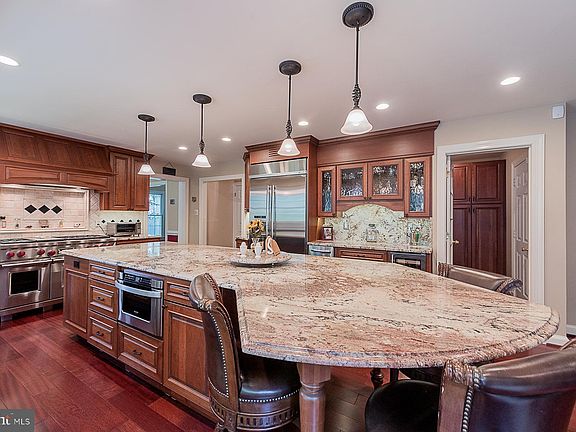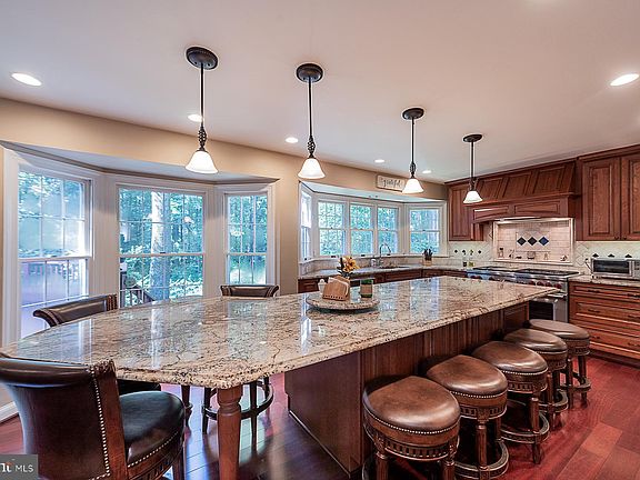 Beautifully upgraded home is perfect for entertaining! Stunning 100K gourmet kitchen remodel will amaze you! Huge center island breakfast bar with gorgeous granite counters, microwave drawer, and tons of cabinet space, seats eight. The chef will love the 6-burner Wolf gas stove and double oven. Wow, there's even a bar complete with wine fridge and ice maker! Stainless steel appliances, custom ceramic tile backsplash, and abundant cherry cabinetry. Gleaming updated Brazilian Cherry flooring flows through the kitchen, on into the family room with gas fireplace. Let the party spill out onto the expansive deck with gas hook-up for grill, and bench seating overlooking a wooded wonderland. The main level continues with a separate formal dining room with huge bay window, and living room with windows galore. A convenient main level office with custom built-in desk & shelving, and a powder room complete this level. Relax in your master bedroom suite retreat, offering spacious dressing room with tons of closet space, and under-eaves storage. Luxurious remodeled private bath boasts marble flooring, dual granite-top vanities, vessel tub and separate shower. Updated skylights in both the sitting room and bath let the light shine in! Three additional large bedrooms, and hall full bath with new luxury vinyl flooring and dual vanities, complete the upper level. The lower level could be great party room or in-law suite. Spacious rec room includes wet bar with refrigerator, opening to media room with surround sound. You'll love the unique wine cellar! Convenient half bath, and storage room with front-load washer & dryer, and lots of built-in shelving complete the lower level. Relax on the wonderful front porch with swing and ceiling fan, overlooking quiet cul-de-sac and tree-lined street! So many updates! Quiet cul-de-sac location! Mins to Columbia Mall & amenities. EZ access to Routes 108, 29, 32 & 95.