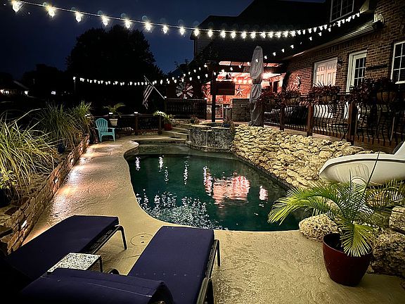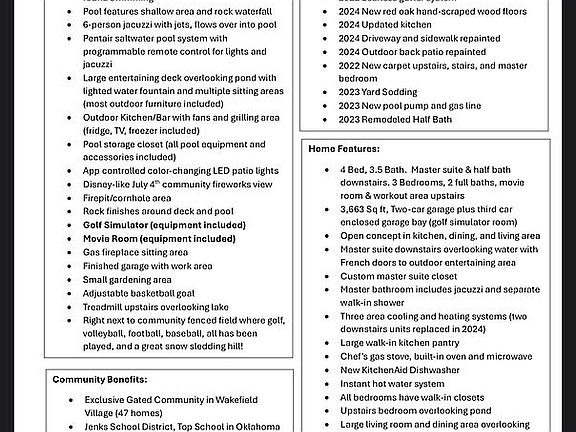 Open House. If the gate is not open call 239-314-8513. Vacation at home with this amazing outdoor living resort-style home with gunite saltwater leisure pool, 6-person jacuzzi, outdoor kitchen and large entertaining patio, all overlooking a beautiful private neighborhood pond and fountain. Ideal lot located on the northernmost part of the community pond. Numerous updates include fresh neutral paint color throughout the entire house, with bright white trim and crown molding, all new carpets, new red oak hand-scraped hardwood floors installed in 2024, two new energy efficient, dehumidifiying HVAC units (2024) and furnaces, new roof with weather resistant shingles and gutters, remodeled half bath, updated kitchen with granite countertops, new paint on back patio and driveway, additional fencing and gate added to back patio, added patio lighting system with app. Repainted garage, storage cabinets included. Master suite downstairs overlooking pond with access to back patio. 3 bedrooms, 2 full bathrooms, media/game room upstairs (projector, screen, recliners, fridge, popcorn machine included in sale of home). Spacious media room could be a bonus bedroom, which overlooks the pool/pond. New pool pump with Pentair remote pool system to turn on pool heater, spa, jets, lights. Outdoor patio furniture, outdoor kitchen tv, fridge, and pool items included in sale of home. Outdoor storage shed included. Enclosed tandem 3rd car garage finished room has indoor golf simulator setup equipment, which is included in sale of home and adds 180 sq ft of finished area to the home. Home is located in Wakefield Village a private/gated community in Jenks School District. Conveniently located 2 miles from Hwy 75 and 2 miles from the Premium Outlet Mall and Creek Turnpike. See full details in the document uploaded as part of the photos. For sale by owner and will happily work with buyer's agents.