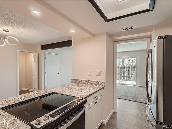 Stylish and New! Everything in this spectacular 2- bedroom main floor, end unit, condo is updated. You won't need to lift a finger after you move in. The open and bright floorplan creates a comfortable great room feel between living room, kitchen and dining room. The new two-tone paint, flooring, and stellar light features throughout the home will provide wonderful backdrops for a buyer drawn to aesthetics. The kitchen wall was opened up to showcase other top-of-the-line finishes including all new cabinets, granite countertops, stainless kitchen appliances (side-by-side refrigerator, built-in microwave, above-mount sink and faucet, cooktop stove & self-cleaning oven). Spacious bedrooms are light & bright with new, ample-sized closets, carpets, and slick ceiling fans. Fully remodeled bathroom is clean & new with a large vanity including several drawers & cabinets. You'll love the in-unit laundry room including clothes washer/dryer. Oversized sliding glass door to fenced patio brings the outside in, also provides adults, dogs & kids with some private, outdoor space. Learn about Cottonwood Villas amenities: pool, fitness center, clubhouse, trails, mature landscaping, and a responsive HOA that pays several utilities to reduce your overhead. One-reserved parking space beside Bldg. 13, visitor parking, and many available off-street parking spaces directly in front of this unit are a bonus. Located a couple minute walk from Wagon Round Park & Ride (RTD) and two lights from I-25 access, this spot is hot! Everything you need is nearby. Take comfort in knowing this is no quick fix & flip; these quality updates were done from the heart in a professional, thoughtful manner. Well worth a visit.