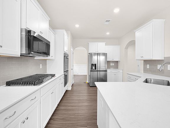 White cabinets, quartz countertops, a gas stove, a double oven, stainless-steel appliances, a tile backsplash, a Ring doorbell, and a smart door lock Community amenities include a clubhouse, a swimming pool, and walking trails.