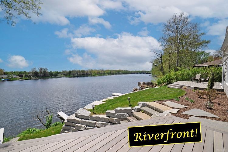 Here's your opportunity to live on the St. Joseph River with gorgeous views from kitchen, dining, family room, main bedroom and brand new open deck! This one story home sits above a beautiful newly landscaped hill with stone walls and stone steps leading to the 100 feet of river frontage with new automatic gas fire pit for those chilly evenings, watching the sunset over the river. Steal seawall and two metal piers with electrical access for boat lifts. Brand new, maintenance free decking across back of home with access from family room and main bedroom has new automatic remote awning and railing with see through glass being installed this week. Home has been completely updated with all new windows and doors, inside and out. Kitchen offers new granite counter tops, refrigerator, double oven range, dishwasher and microwave. New flooring throughout with heated porcelain tile floors in bathroom and hallway. Family room has beautiful marble tile fireplace with an auto gas log. Large main bedroom has adjoining newly remodeled bathroom with double vanity and walk in shower. 2 other bedrooms with ample closet space and bonus computer mud room off of first floor laundry room. Furnace, A C and water heater have been replaced along with gutters and vinyl siding. Attached double stall garage with off street parking, storage shed, professionally landscaped with irrigation system. Walking distance to Penn schools and close to bypass for easy access to Notre Dame and shopping. Schedule a private showing today!