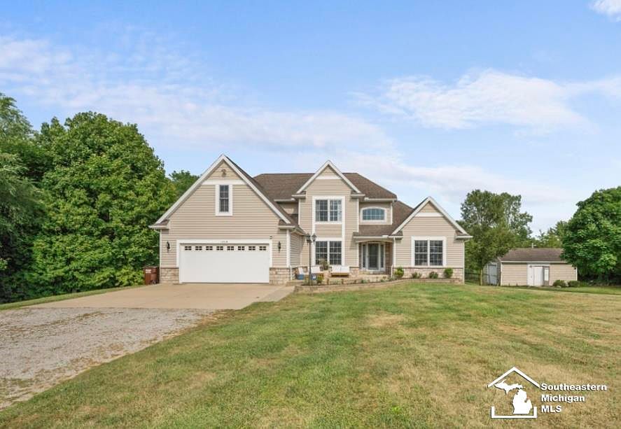 This stunning two-story, 4-bedroom home on a beautiful 2-acre lot offers a spacious open-concept design perfect for modern living. The large great room features a vaulted ceiling, cozy fireplace, and abundant natural light. The kitchen is equipped with an island, ample cabinetry, stainless steel appliances, and an eat-in area overlooking the serene, fenced backyard - ideal for hosting gatherings and entertaining. Main-floor highlights include a convenient laundry room and a versatile flex space for dining or a home office. The first-floor primary suite features a walk-in closet and a luxurious private bath with double sinks, a jetted tub, and a walk-in tiled shower. Upstairs, you'll find 3 generous bedrooms and a loft/additional living area. The finished basement offers abundant storage and a spacious recreation room. A shed/additional garage provides even more functionality for outdoor equipment. Step onto the newly built composite deck and enjoy peaceful country surroundings- perfect for relaxing and unwinding.