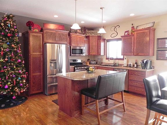 Gorgeous move-in ready Split-Level in SE Minot! Custom, staggered height oak cabinetry line the kitchen and are complimented with high definition countertops, stainless steel appliances (gas range!), pantry with pullouts and an island for added storage. The dining area is just off the kitchen with a door to your 291 sq. ft. maintenance free deck! The living room is inviting and the bay window provides great natural lighting. The spacious master suite boasts a walk-in closet and bath access. Bedroom 2 is good sized with carpeting and large closet. Heading a few steps upstairs you will find a large, bonus third bedroom! The finished, daylight basement has a HUGE family room with wiring for surround sound, a gas fireplace and AMAZING wet bar! Bedroom 4 is also good sized and the full bath has heated tile and a large closet. The laundry/mechanical room also provides added storage space. This home also boasts 9' ceilings, custom blinds, heated triple garage w/ floor drains and is situated on a .40 acre lot in a cul-de-sac! The yard was professionally fenced by Legacy Fence and fully landscaped by Lowe's with underground sprinklers, curbing, perennials, shrubs and 13 trees--Wow! This home is close to many amenities including the new elementary school and Minot Country Club, check it out today!