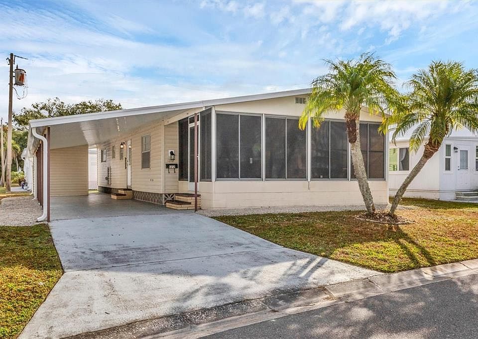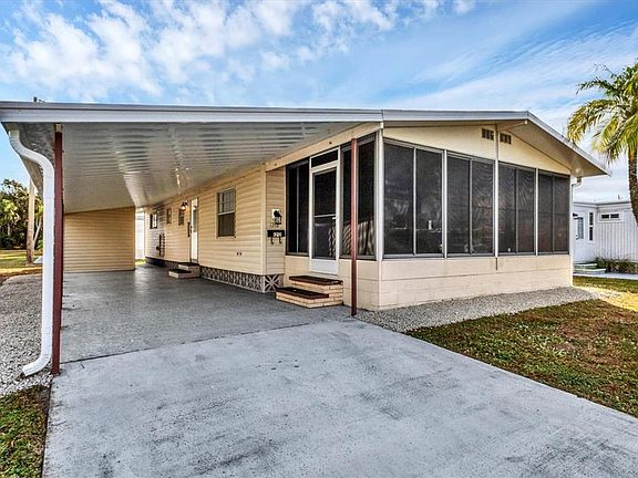 Welcome to Tidevue Estates, a desirable land-owned 55+ community, where this beautifully updated home is truly move-in ready. Step inside to discover life-proof vinyl flooring throughout, fresh drywall, and upgraded ¾" plywood subflooring offering long-term durability and peace of mind. The bright Florida room at the front of the home—enhanced with ceramic tile and a brand-new mini-split A/C—creates the perfect space for relaxing or entertaining. A stunning white-washed decorative plank wall adds a modern coastal touch. The spacious living room flows seamlessly into the Florida room, creating an open, welcoming layout. The kitchen features oak-colored cabinets, faux granite mitered Formica countertops, ceramic tile flooring, and a brand-new LG refrigerator. The open dining area has a serving counter, and a wine cooler to make hosting effortless. Choose between two primary bedrooms, each with its own en-suite bathroom, offering comfort and flexibility for owners or guests. Additional updates include all new electrical outlets and receptacles, a new electrical panel, and a new roof-over the Florida room and carport (2025) plus a new water heater. Outside, enjoy an extra-large carport with plenty of space to create an outdoor living area. The home also includes a one-year American Home Shield warranty and pest control, giving buyers added confidence. Low HOA of only $600 annually. Pets are not permitted. Plenty of activities to keep you busy in this community. Updated fitness center. Meet friends and make new ones for a game of indoor pickleball, bocce ball, or shuffleboard. Join the Golf League. Take a bike or golf cart ride to Veterans Park to watch the wildlife and enjoy the sunset. Ellenton Premium Outlet Mall, restaurants, and medical facilities are just minutes away. Easy access to I-75 to explore Sarasota. Not to mention a short drive to our beautiful Gulf Beaches.This well-maintained, stylishly updated home is ready for its next owner. Don’t miss this opportunity—move in and start enjoying the Florida lifestyle today!