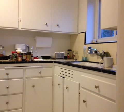 Open kitchen designOverlooking the gardenHigh ceilingsTons of natural lightVintage color tilingLarge windowsCorner one bedroom