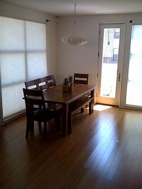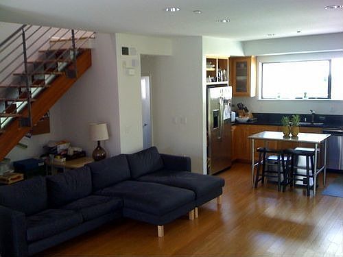3 level townhouse style condo. End unit with only 1 shared wall (no other units above or below). Very sunny. First floor is the den with dark pergo floors. Second floor has living room/dining room/kitchen combo with a half bath, all bamboo flooring. Top floor has 2 bed/2bath, berber carpeting, and washer/dryer combo. 2 Car garage. Patio off the living area.