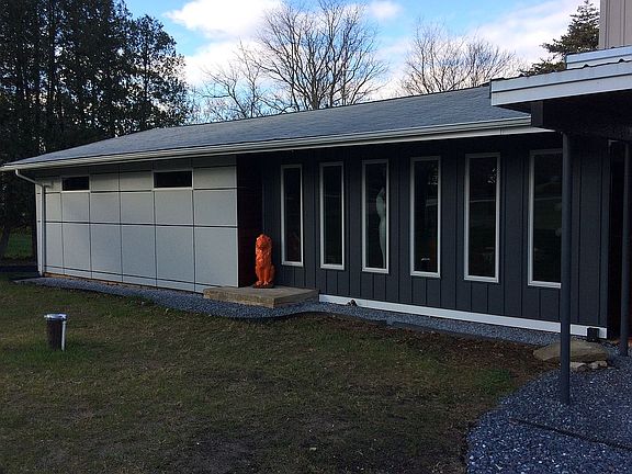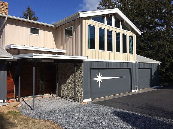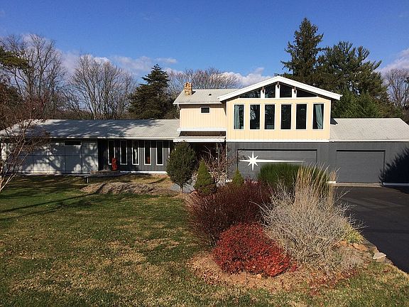 Mid Century Modern Rancher with separate in-law loft above garage. Renovated entrance with 54” wide pivot door. Marble floor vestibule. Single step up onto all wooden parquet floor throughout entire house. Kitchen has old Wooden cabinets, new stove, oven, fridge and dishwasher. Adjoining dinning room and sitting room. Large master bedroom and another single bedroom. 2 full baths, both with walk in showers. Steps downstairs to TV room and unfinished utility room.