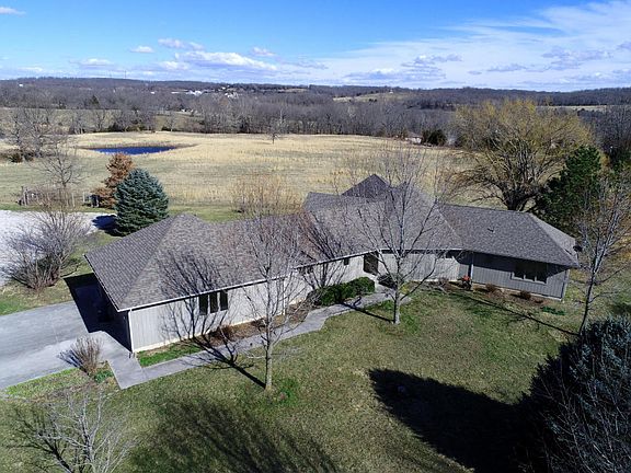 A beautiful single-level home on nearly 20 acres with easy access to Springfield! This unique layout provides very open and spacious living, dining, and cooking - in the round! 2 pantries. Split bedroom plan with large laundry/mudroom, plus a huge den through French doors. No carpet! Below-ground STORM SHELTER built by this seller with escape hatch. Tons of daylight in the house, plus 3 decks to enjoy the outdoors. One is a screened-in covered deck with composite decking to soak up the fresh air without the mosquitoes! Newer (2015) heat pump & 50-yr roof. New kitchen appliances too. All of that plus a metal barn for the animals, includes electricity, 2 stalls and woodburning stove. Man-made pond & a corral with easy-access water for the heated water tank. Hurry before this beauty is gone!