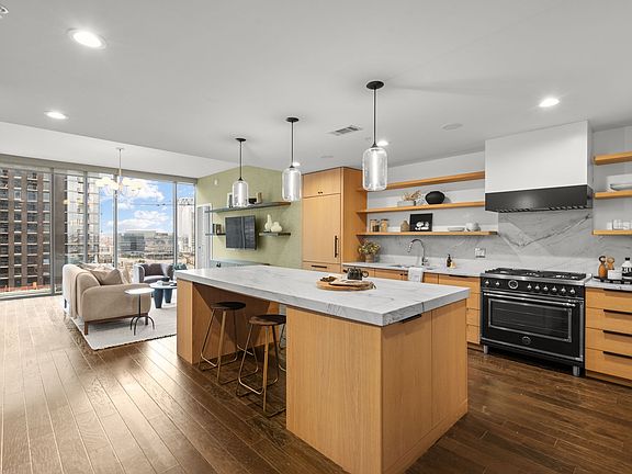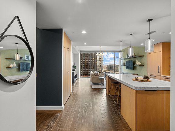 Timelessly elegant, a renovated condo in Twelve Twelve. This kitchen boasts an entertainers dream with oversized oven, fridge, and hidden compartments throughout, whether you prefer a home office or coffee bar, this home has it! Cozy up in the den/ movie room or enjoy the bright views in your living room. Guests may enjoy their retreat and full bath while the homeowner retreats to their hidden hideaway. Warm and cozy one will be in the primary suite with its own walkthrough closet and renovated bathroom. Should one prefer to eat out rather than dine inside, you are to many restaurants and venues in minutes. Enjoy Twelve Twelve's fifth floor amenity floor with pool, hot tub, workout room, and herb garden.