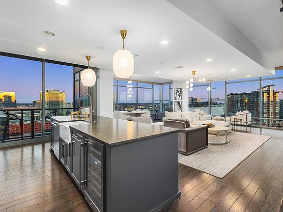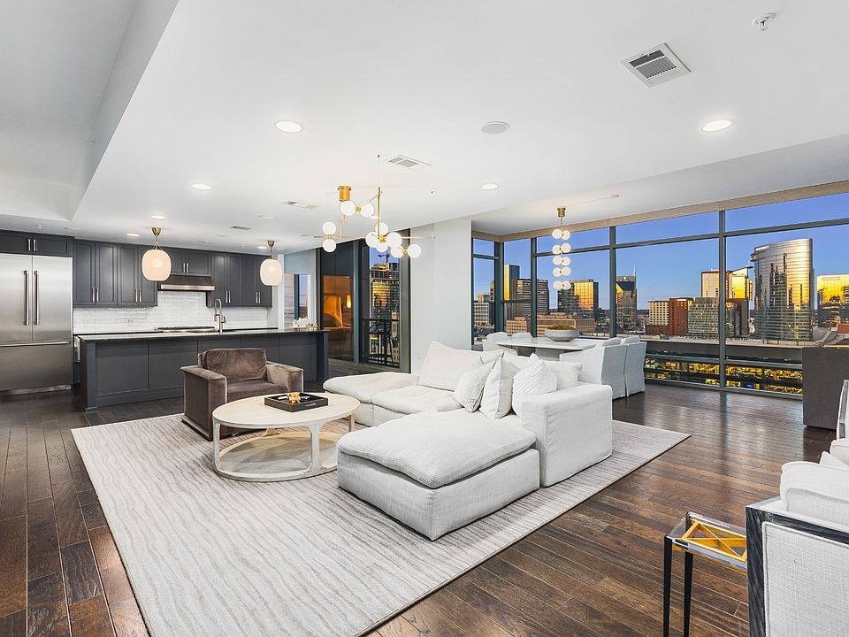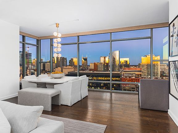 Nashville’s premier corner unit residence in the heart of the Gulch. Enjoy bold, unobstructed panoramic views of Downtown and The Gulch from every angle. Custom design and upgrades throughout create a luxuriously warm ambiance. Completely new kitchen with leathered granite countertops, all new upgraded cabinetry, farm sink & new appliances including a wine fridge. Beautiful wall coverings, custom blinds, and designer-selected lighting fixtures. The upgraded primary bathroom adds a touch of spa-like luxury. Each bedroom features an ensuite bath and custom walk-in closets. 2 private balconies, 2 deeded premium parking spaces. Experience a turnkey lifestyle with walkable distances to everything the Gulch & Downtown offer. 12|12 offers 2 guest suites, a salt-water pool, hot tub, green roof, 24/7 security, a trainer-driven fitness center, indoor dog walk, outdoor dog park, and 2 exclusive owner lounges.