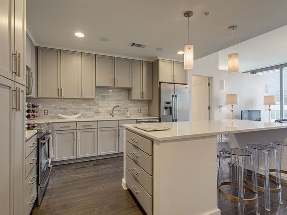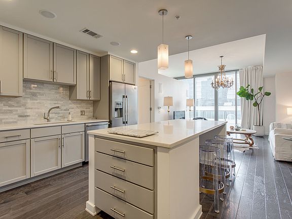 Same-level covered parking and an AMAZING skyline view! The Gulch's best address. Large, quiet one-bedroom unit. Designer finishes (seller is a designer), office area, blackout curtains in bedroom and living room, large balcony, custom auto-illuminating closet. Built-in 6-seat kitchen dining. Open plan. A few blocks from new Amazon and Asurion HQs. Restaurants, bars, groceries, shopping galore. Great for primary or second residence.