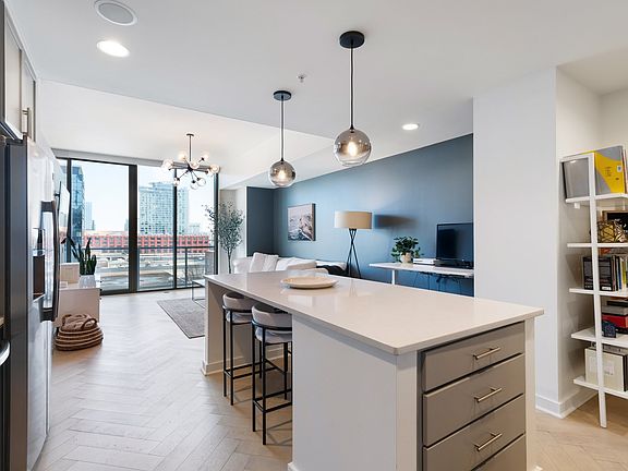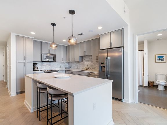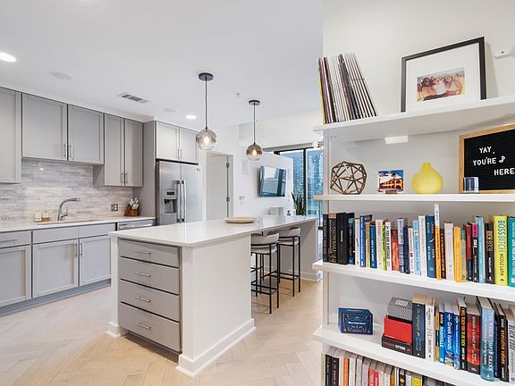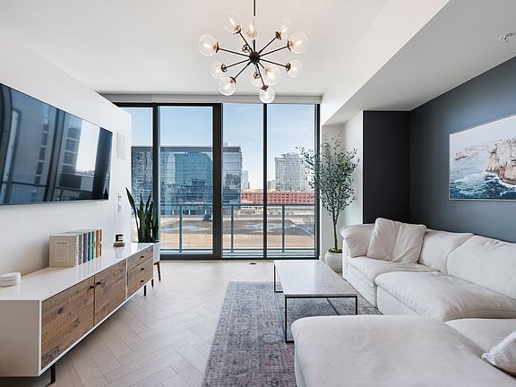 Open and airy, this unit boasts top-of-the-line finishes, plus unobstructed views of Downtown Nashville & Nashville Yards cityscapes! Lovingly maintained with custom built-ins, gorgeous herringbone-laid floors and transitional decor. One of the most functional one-bedroom layouts in the complex. Key features include an open concept eat-in Kitchen and Great Room, a generously sized walk-in closet, in-unit washer/dryer, and prime location within the building. Washer/dryer & refrigerator remain with the unit. Do not miss all the amenities galore on the 5th floor - gathering room, pool/spa, grilling deck, catering kitchen, and expansive gym. This is a rare and special opportunity.