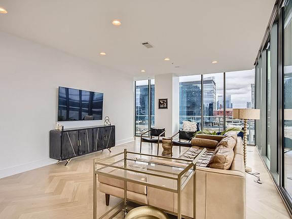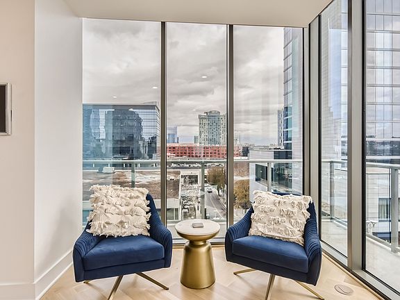 Show-stopping corner unit with floor-to-ceiling glass overlooking Downtown, Gulch, & the W Hotel! One of the largest 2BR plans in the building at 1470 sqft; where the extra couple hundred square feet make a huge difference in space and feel. Bright light kitchen, full dining area, open living room, light hardwood floors, auto window shades, and two walk-in closets combine to create a turnkey, luxury lifestyle. The wrap-around balcony provides even more space to take in the sights and the energy of the city. Walk to Whole Foods, Starbucks, dog park, Bridgestone! Nashville's best amenities include 24hr concierge, year-round salt-water pool/spa, fitness facility, dog spa, owner's lounges, fire pits, guest suites, bike storage, shuffleboard, green-space terraces, and outdoor kitchens. Condo includes 2 side-x-side deeded parking spaces & storage unit on same floor as residence.