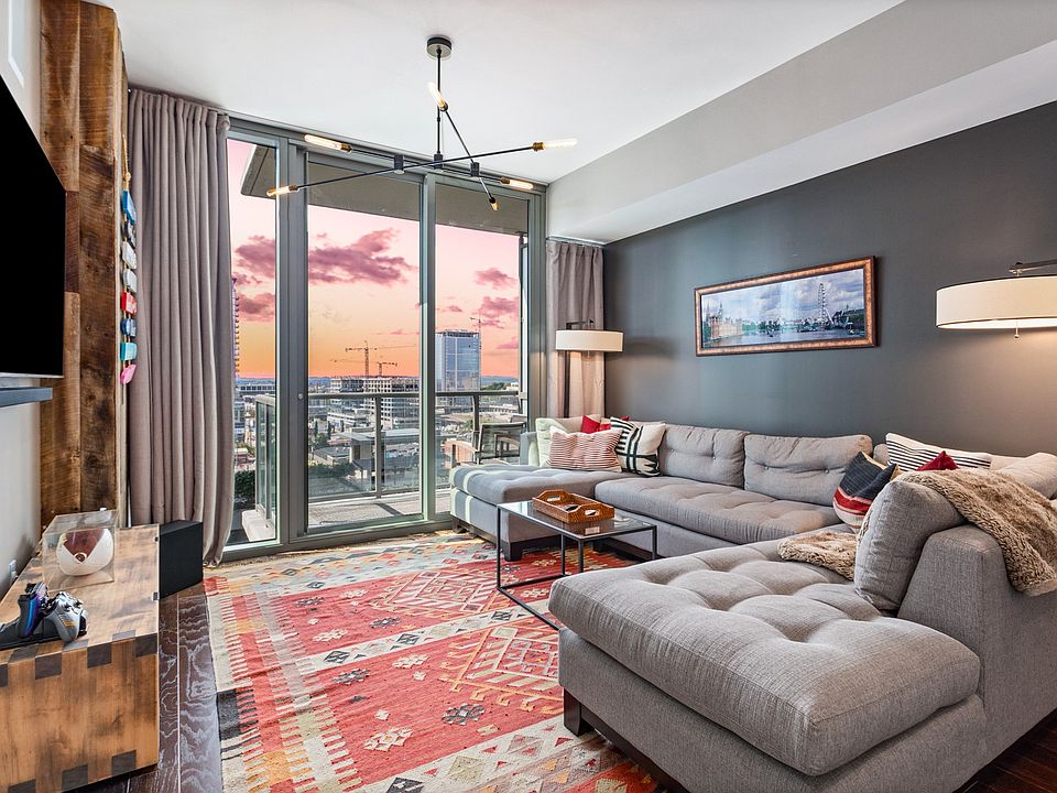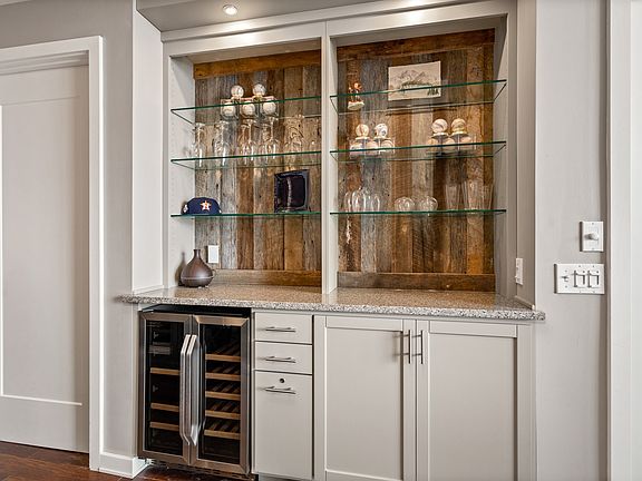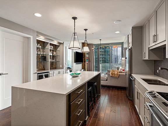 This unit has been highly upgraded including built-in bar with refrigerated wine cooler & additional storage, kitchen island with waterfall detail & extra storage, gorgeous kitchen backsplash, painted cabinets with updated hardware, designer light fixtures, reclaimed wood headboard wall, and luxe wallpaper in bath. Unit also features 2 closets, both with custom California Closest system and 1 covered parking space.