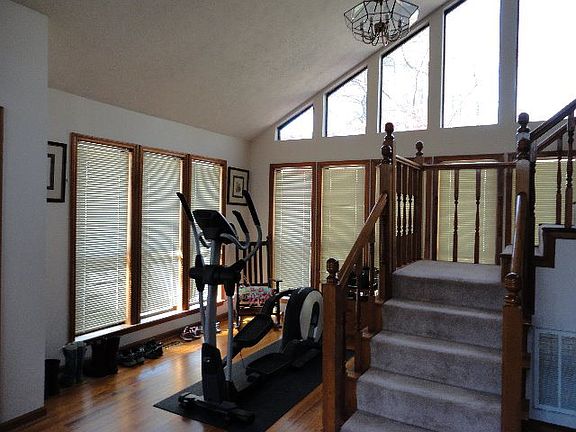Charming home, the feel of Living in Mountains, fireplace/chimney beautiful focal point, has overlooking balcony. Has potential man cave basement.