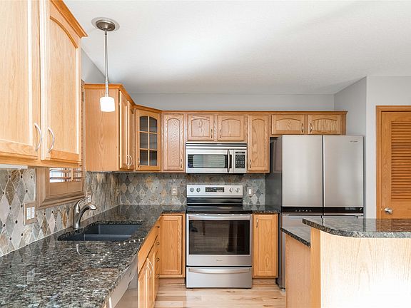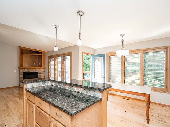 Welcome to this well-maintained ranch offering 5 bedrooms and 3 bathrooms with thoughtful updates throughout. The main level features 3 bedrooms, including a primary suite with full bath, double vanity, and walk-in closet. The spacious living room boasts vaulted ceilings, a cozy stone fireplace, and beautiful Hickory floors. The kitchen is complete with granite counters, a center island, and newer stainless steel appliances. The finished lower level, remodeled in 2019, expands your living space with 2 additional bedrooms, a full bathroom, and a large family room. Updates include quartz countertops, new carpet, and an electric fireplace installed in 2019, creating a warm and inviting retreat. Step outside to a cedar deck and mature trees, creating a great space for relaxing or entertaining. A spacious 3-car garage adds both convenience and functionality. This home blends modern updates with long-lasting quality in a prime location near schools, parks, shopping, and dining.