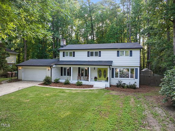 Beautiful home in incredible Cary location nestled on a private, tree-lined Cul-De-Sac lot! Bike to plenty of shopping and dining options, including Crossroads and Fenton shopping centers! No HOA! Welcome guests into the spacious foyer with built in seating and storage! Stylish, contemporary flare has been lovingly built into this unique home, starting with the striking staircase with accent wall! Built-in shelving, updated light fixture, and cozy brick fireplace in family room create an inviting space to unwind! Gorgeous eat-in kitchen offers stainless steel fridge, double wall oven, and tile backsplash! Dining room with accent wall is perfect for formal dinner parties! 1st Floor In-Law Suite with private en suite is perfect for multigenerational living! Second floor offers 5 additional bedroom options including spacious owner suite with walk-in closet and spacious tile shower! Theater room is perfect for taking movie nights to the next level! Enjoy the best of outdoor living in the spacious backyard with privacy fence! The large 2022 built back deck features covered hot tub! This fenced backyard with greenhouse is a gardener's dream! Enjoy two mature fig trees, a mature bed of asparagus, blueberry and blackberry bushes and an inground garden plot!