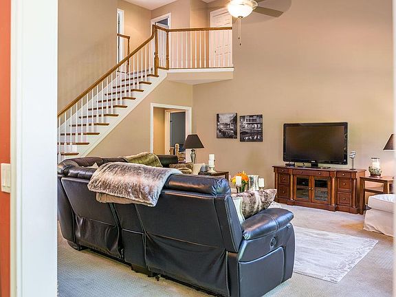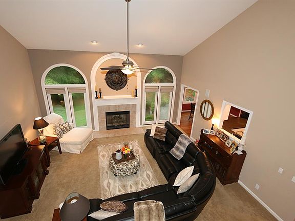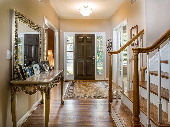 Beautiful transitional w/first floor master suite! Soaring great room w/palladian windows. Bright & cheery kitchen opens to solarium. Level, wooded lot w/stamped concrete patio. First floor study, newer AC, roof, windows, hardwood floors + carpet. Sprinkler system. Beautiful home-pool community. Must See!