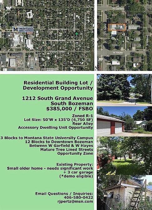 Residential Building Lot / Redevelopment Opportunity (existing small house would need significant work to be habitable) 3 Blocks to Montana State University Campus 12 Blocks to Downtown Bozeman Between W Garfield & W Hayes Mature Tree Lined Streets Opportunity Zone Zoned R1 Lot Size: 50'W x 135'D (6,750 SF) Rear Alley Accessory Dwelling Unit Opportunity Existing property has small uninhabitable older home + 3 car detached garage (all demo eligible)