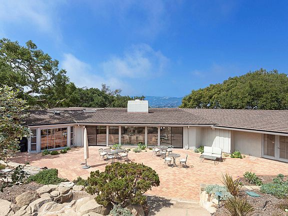 Nestled in the exclusive neighborhood of Hope Ranch with stunning mountain views in a quiet cul-de-sac among mature oak trees and meandering path ways. The single level estate on 1.14 ac, features 5 bedroom en-suites, family room, hot tub, pool, a half bath and bar area for entertaining. Open floorplan filled with abundant sunlight from numerous windows and doors that open to patios for the ultimate indoor-outdoor enjoyment. Cathedral ceiling in living room. Formal dining room and living room complemented by a double-sided fireplace. Spacious master suite opens to an expansive view deck to take advantage of the spectacular views. Kitchen with ample cabinetry and breakfast nook. You can enjoy the Hope Ranch lifestyle with tennis courts, hiking trails & access to private HR beach.