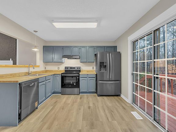 Absolutely adorable home. Renovated and all dolled up! JUST PAINTED INTERIOR AND EXTERIOR. NEW DISHWASHER, VENT HOOD AND RANGE. NEW FLOORING. NEW LIGHT FIXTURES AND CEILING FANS. NEW VANITY AND TOILET. NEW HVAC!! Kitchen cabinets repainted and kitchen butcher block counters have been refinished with a solution safe for food preparation. Fireplace mantel replaced. Light is wonderful in this home with large windows, vaulted ceilings and skylight. Large deck has been repainted and there is an out building for additional storage. Location is fantastic. 2 miles to grocery store, major highways, shopping and more. A wonderful place to call home. NO HOA dues!