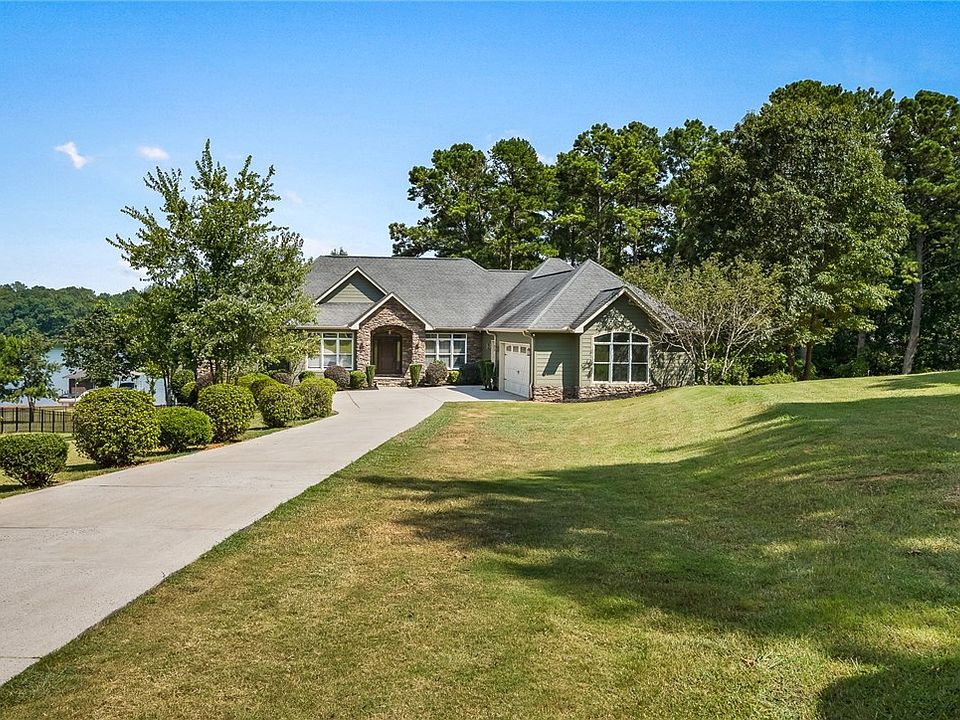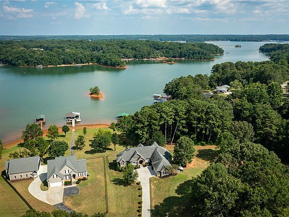 Beautiful Lake Hartwell Home with one of the few gentle slopes to the shoreline. Amazing views day and night. 157+/- feet of shoreline. No H.O.A....no restrictions....conveniently located. Come, view and explore the opportunities this property offers. This CUSTOM built, one-owner home, featuring 5555 square feet of heated and cooled space. 5 total bedrooms and 5 bathrooms. Once you step into the foyer will find a study off to the left and straight ahead is the Great Room with vaulted ceiling, stacked stone fireplace and the amazing view of the lake. The open concept design of the Great Room, Dining Room, Kitchen and Breakfast offer an abundance of space with natural light from the windows and doors. Take a moment to stand on the 30x12 covered porch and envision entertaining your family and friends. There is a natural gas hook-up for your grill on this porch. The gourmet kitchen is appointed with granite countertops, stainless appliances and beautiful tile floors. Enjoy your morning view from the Breakfast Area and open the French doors onto another covered porch which boast a stacked stone fireplace for those cooler evenings. This split bedroom plan on main offers privacy and a full bath for each of the 3 bedrooms. The en suite primary bedroom has a trey ceiling with lots of natural light and amazing views of the Lake. The Primary bath and closet area is very spacious. Separate closets as well as a huge linen closet. Pass through the double glass doors and enter the primary bath appointed with vaulted ceiling, double sinks, soaking tub and custom tiled shower. The main floor is primarily hardwoods, with tile and 2 bedrooms are carpeted (new 2023). Down the stairs you enter the huge recreation room with kitchen area/cabinets and beautiful stacked stone fireplace (gas logs) and ceramic tiled floors. There are 2 additional large bedrooms with private baths for each. Enter the Media Room and just imagine all your favorite college football games or movies on a large screen. A gym area adjoins the large media room. Don't miss the concealed room off the right basement bedroom (initially planned for a wine cellar/not heated or cooled). Tons of storage in the basement (finished and unfinished). The lower garage offers you space for all your lake toys or yard equipment. This home offers lots of opportunities for your guests with boating, fishing and minutes to restaurants on the water. Portman Marina and the Galley Waterfront Restaurant are a short boat ride away and if you take your boat north on the river it's about 30 minutes to Clemson University... This floorplan was well thought out and is perfect for entertaining large groups. The three car garage and driveway offer parking for you and your guests. A portion of the backyard is fenced but the area toward the shoreline is level and offers an easy walk. The covered double slip dock with gangplank walkway is very manageable. The dock has electricity as well and a lift for one slip. Please show this custom home convenient to Greenville and less than 2 hours to Atlanta. Many adventures and memories await you in this lakefront home on Lake Hartwell. Please note this listing has been staged 'virtually' for marketing purposes.