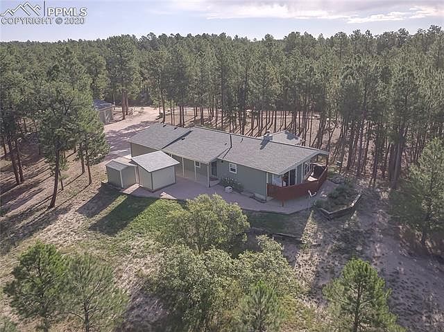 Unbelievable estate living opportunity or prime development opportunity in the heart of Black Forest. 35+ acres of fully mitigated, mature ponderosa pine. Domestic well allows a second home. Fully fenced, immaculate modular home with hot water heat and many upgrades plus three car attached garage and a three car detached garage plus work area/3 additional sheds w/ one used has an artist area. Beautiful condition with covered front porch, garden pond, landscaping and a second deck with Pikes Peak views. OR a development opportunity as zoned RR-5 with all lots accessing Casey Lane and preliminary survey showing 7 lots platted attached here. Land is rolling and trees have been groomed. Acreage runs from Shoup Road and down Casey. Close to Black Forest Park, shopping at Flying Horse, and award winning schools. No sign on property, please call to walk land. Serious inquiries only will access home and outbuildings
