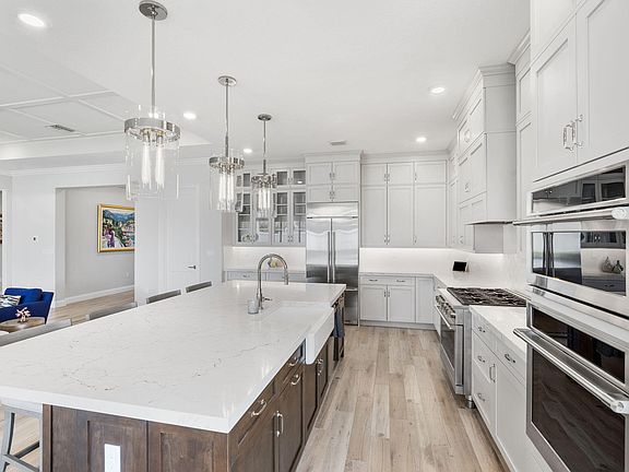 The gourmet kitchen is a chef's dream, featuring top-of-the-line gas appliances, custom cabinetry, and a center island perfect for entertaining guests or enjoying casual family meals. The adjacent dining area provides a welcoming space for formal gatherings, while the spacious family room offers a comfortable and lush retreat for relaxation.