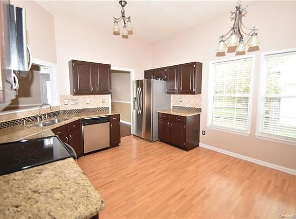 Beautifully maintained + updated, charming ranch, picture perfect home located in Ballantyne area. Updated kitchen w/granite and stainless steel appliances. 10 foot ceilings, hardwood laminate floors. Master bath Rm updated a must to see. A Large master bedroom with huge walk-in closet; large great room with fireplace, large deck and fenced in yard that backs up to woods, very private. 2 car garage. Just off Rea Road. Could walk to shopping + restaurants. Location, Location! Great Schools, Washer and Dryer Included.