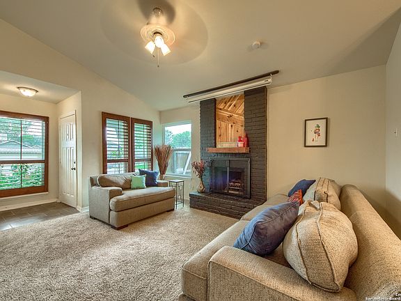 DARLING SINGLE STORY HOME IN THE HEART OF SAN ANTONIO! This affordable three bedroom is nestled in the ideal neighborhood of Stoneridge next to McAllister Park--imagine building equity in an updated bungalow with a huge covered patio perfect for entertaining, a nice size yard and a charming interior with new carpet and custom paint accents. Step from the street into this cutie with its beamed cathedral ceiling living space dressed up with wood plantation shutters. Admire the centerpiece brick fireplace with cedar inlay. The dining room offers a view of the patio through double sliding doors and its wood look tile flooring flows into the farmhouse kitchen worthy of HGTV! Custom wood open shelving, cyan cabinets, antiquey hardware and granite counters will make you want to cook every night. Down the hallway find the bedrooms -- two secondaries with charming paint accents and then the master at the rear with a walk-in closet and its own vanity. The bathroom is an incredibly thoughtful arrangement with access from both the master and the hallway with doors to create plenty of privacy when needed. A tub shower combo offers updated tile surround and more open wood shelving adds another farmhouse touch. The big bonus is the second, large, living space in the converted garage -- complete with a laundry closet and perfect for game room, office or hobby room with plenty of natural light. Out in the back plan the parties on the porch and then let your imagination be your guide in the yard where you will find plenty of room for gardening, playscape or pet play. All this just a hop off the Wurzbach Parkway between I-35 and 281 and an easy run down to Loop 410 or up to 1604, making it an ideal location for downtown commuters or military at SAMMC, Fort Sam or RAFB! Coveted NEISD schools. Run, don't walk to this one before someone else swoops in and calls her home.