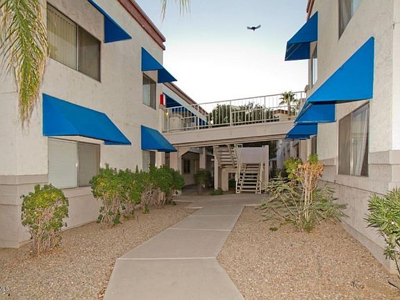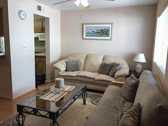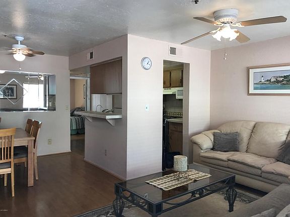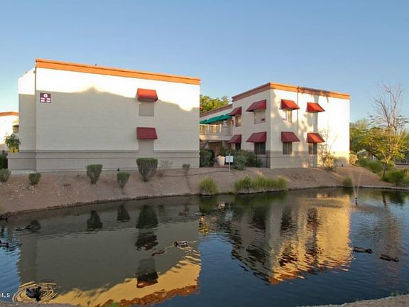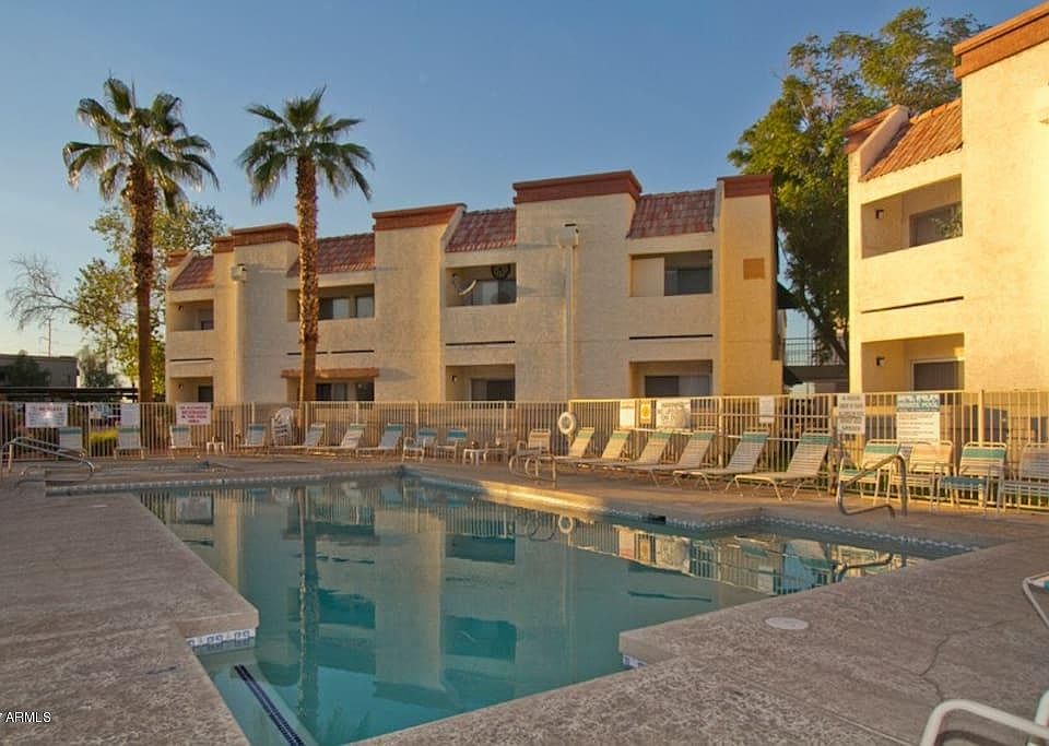 Very well maintained second floor condo with prime location and excellent views overlooking the heated community pool and spa. Wood laminate and tile floors throughout. Kitchen features tiled counter top, microwave, refrigerator, washer and dryer that stay. 1 assigned covered parking space and elevator accessibility. Nice common areas with BBQ's plus rec center with kitchen/social hall. Easy access to Bell Road with lots of shopping and restaurants nearby. All furniture and accessories/decor items are included.