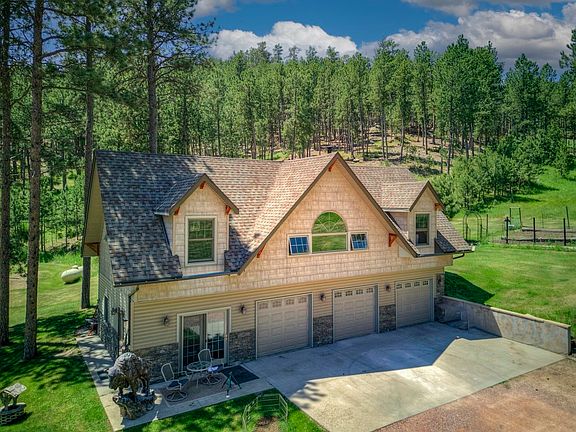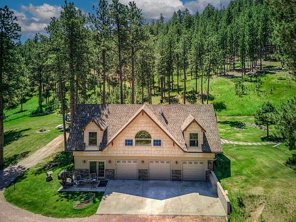 Pristine & very desirable end of the road setting for this Black Hills Home! The1368 sq. ft. home has the perfect setting that captures privacy, surrounding granite rock landscape and the National Forest Service!! The upper level is open with vaulted ceilings, spacious kitchen with hickory cabinets, beautiful countertops, gas range and pantry. Great dining/living area and 16x17 primary bedroom with ensuite bath. Spacious 10x38 composite deck with views and a lower patio area. The 3 stall insulated heated garage could be easily converted into extra living/bedroom space. 28x20 fenced garden area The 30x52 Morton building is insulated, has a concrete floor, separate electrical panel, 2 floor drains, 2 separate bay/parking areas ---1st bay is 30x21- 2nd bay is 31x14 both have separate garage doors. Included in the Morton building is a 6x7 shop area and a 14x19 living space. The living space has a separate entry, is insulated, with wood burning stove & the bathroom is stubbed in. Perfect setup for guest/family for RVs. (2) RV Hook ups-- 50 and 30 amp. Cistern can be used for garden or RVs. NO COVENANTS and fiber optic in place. For more information call Anne 605-673-1177. $675,750. MLS#80751