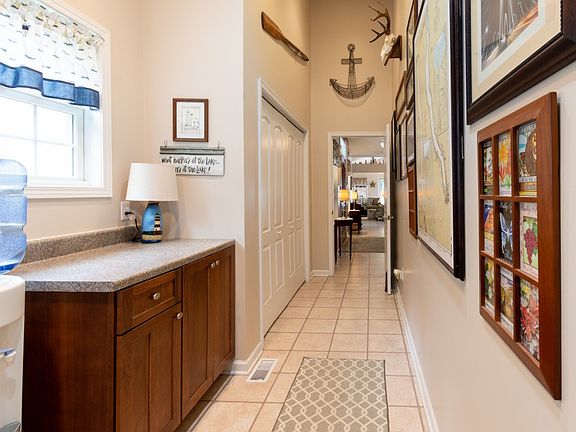 Single family ranch style home with 2 car attached garage, lake frontage, dock, boat hoist, waterside deck