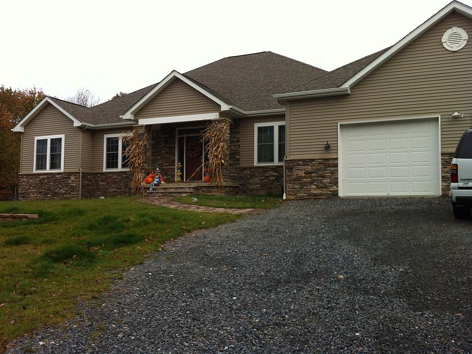 Custom built luxurious ranch home on 4.96 acres, with open floor plan. Featuring 3 bedrooms, formal dining room and large foyer entryway into spacious family room with 12 ft vaulted ceilings. 2.5 baths with granite countertops, custom cherry cabinets in kitchen with granite countertops. Unfinished basement at 2750 sq ft. Total house 6400sq ft. If you want serenity and peace with panoramic views this home is for you!