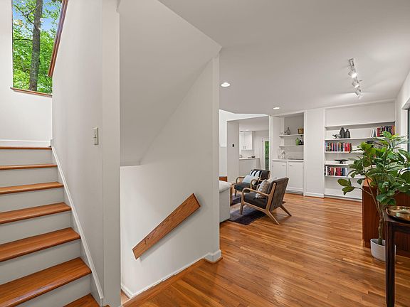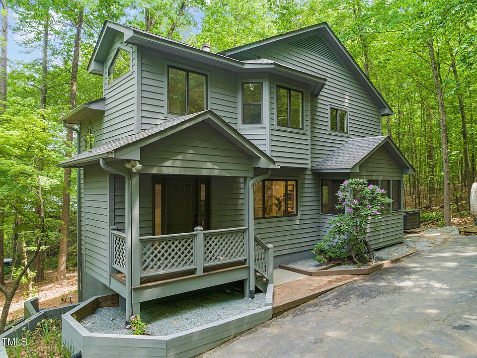 Rare opportunity for a beautiful 3BR 2.5BA John Hartley custom home in the desirable Heartwood neighborhood. This updated contemporary home with a plethora of large windows is an oasis of tranquility. Trees offer this light-filled home a feeling of privacy. The main level has the kitchen, dining, and living area with a fireplace, 2 decks, and a screened in porch. The second level has the primary suite and an open sitting area/office area that feel like being up in a treehouse. The lower level has 2 small BR's, a full bath, and a small living area with its own screened-in porch and separate exterior entrance. Heartwood is a thriving community, whose amenities include playground, basketball court, swimming pond, walking trails, community garden, and amphitheater. Easy access to Duke Forest trails, Spence's Farm and Emerson Waldorf School. No City taxes, yet close to many things like a UNC Family Health Clinic, indoor pickleball, groceries, restaurants, movies & shops at Timberlyne Shopping Center. Also, leave your car at the Eubanks Rd Park & Ride and bus to many places in Chapel Hill and on UNC Campus.