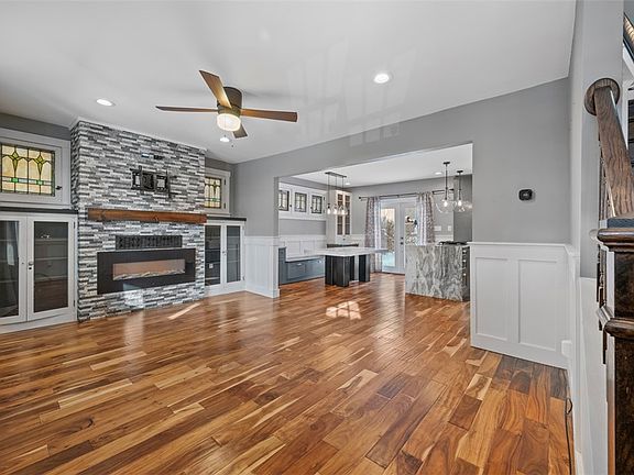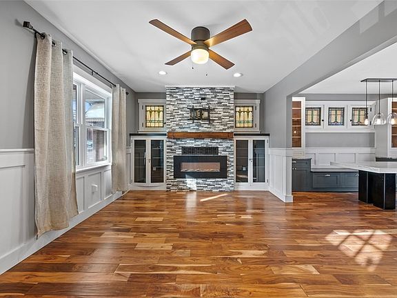 Discover this beautifully renovated two-story home, blending modern updates with timeless charm. The welcoming front porch leads into a semi-open floor plan featuring hardwood floors throughout the main level. The living room boasts built-ins, stained glass windows, and an electric fireplace for a cozy ambiance. The custom-designed dining room offers picture box chair rails, built-in seating, cabinets, and modern lighting. The chef’s kitchen impresses with waterfall granite countertops, stainless steel appliances, two-tone cabinets, a 5-burner gas cooktop, and abundant counter space. Upstairs, the spacious master bedroom features a shiplap accent wall and an updated bathroom with custom cabinetry, soapstone countertops, and a subway-tiled shower. Two additional bedrooms and an office provide flexibility. The lower level offers storage, laundry, and updated mechanicals. Enjoy the private patio, fenced yard, and detached 2-car garage. Close to Memorial Park, restaurants, and shops!