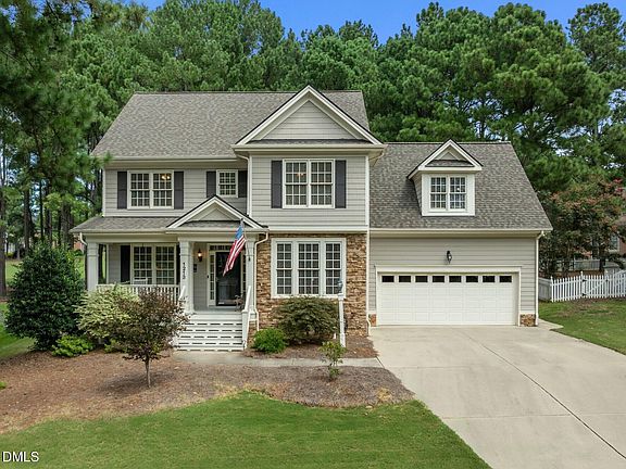 Welcome to 1213 Crozier Court located in highly sought after Heritage community. This home features 4 bedrooms, 3.5 baths, 3016 square feet, and is nestled on a .23 acres overlooking the Heritage golf course! Hardwood floors and crown molding flow throughout the first floor. To the right of the foyer, the formal dining room boasts a tray ceiling, chair rail, and double French doors with a transom. To the left, a sitting room offers flexible use as a home office or study and opens into the inviting family room with a gas log fireplace, custom mantle with fluted trim, and built-ins. The spacious kitchen showcases natural stained raised-panel cabinetry with brushed nickel pulls and a glass display cabinet, granite countertops, tile backsplash, pantry, and stainless steel appliances including a gas range. A sunlit breakfast nook, surrounded by windows, overlooks the backyard with a stamped concrete patio and mature landscaping. Upstairs, upgraded carpet and crown molding line the hall. The owner's suite impresses with crown molding, ceiling fan, and double French doors leading to a private balcony with golf course views. The spa-like bath offers vaulted ceilings, tile flooring, jetted soaking tub, separate tiled shower, dual vanity with cultured marble, and a large walk-in closet. Secondary bedrooms are generously sized, and a recreation room with back staircase adds convenience. The finished third floor includes a versatile rec room with closet. Enjoy proximity to Heritage's resort-style amenities—including two pool complexes, tennis and pickleball courts, playgrounds, and greenway trails—all available through a separate membership. Golf, dining, and social memberships are also available at the Heritage Golf Club. Convenient location just 10 minutes north of Raleigh, with easy access to RDU Airport, NC State, Duke University and the RTP. Near major shopping (Triangle Town Center, Harris Teeter, Lowes Foods), dining, schools, medical facilities, and The Factory entertainment complex.