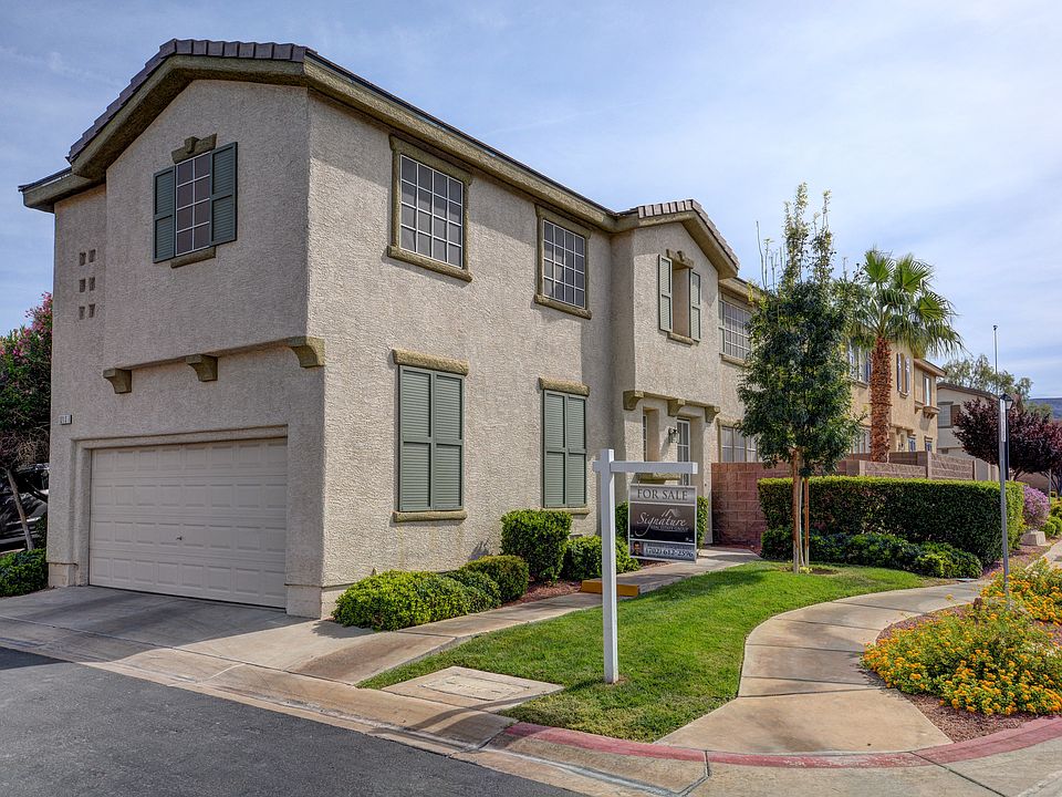 Wow! Location, Location! 4 bedroom 2.5 bath in gated community with a pool near Stephanie and 215! This corner lot home is over 1700 square feet with a 2 car garage. Downstairs open living area with dining room and kitchen that features espresso cabinets. Nice sized L-shaped backyard with a covered patio. Master bedroom has a large master bath with separate tub and shower and double sinks! Upstairs laundry! Won't last!