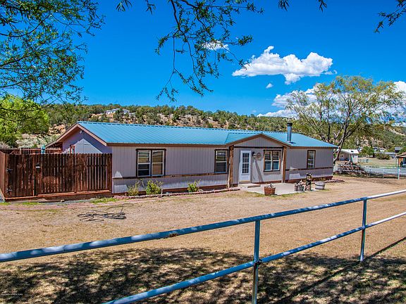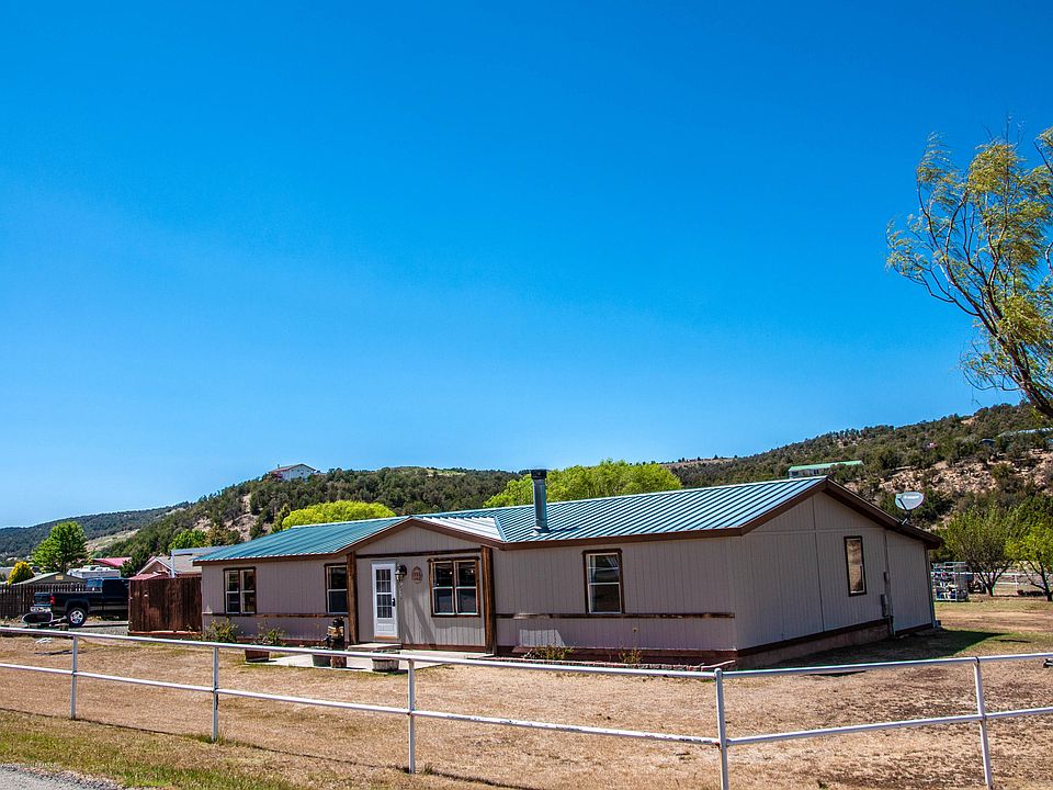 NICE, LEVEL APPROX. 0.70 ACRES! Life is relaxed with this ranch style, one level mfg. double-wide home with adjacent lot, pipe fencing and views. 3 BR/2 BA with split bedroom floorplan. Carpeting with laminate flooring, antique barn wood accents, multi-use breakfast bar. Fenced West patio. Useful workshop and shed, 3 vehicle carport, large rear covered patio. Security system, water, sewer and natural gas. Warm and bright with pleasing amenities.