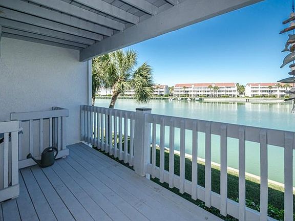 Waterfront community of Capri Harbor, located on quiet Isle of Capri. A peaceful water view over the Capri Harbor and intracoastal waterway. Two bedroom, two and one half bath town home with a full one car garage, and bonus room on ground floor, not included in square footage. Corian surface counter tops and solid wood cabinets with custom features and pull out breakfast table when needed. Nice walk in pantry and large eating bar opens to formal dinning room and living room. Corner fireplace and open balcony deck greet you in the living room, with entire second floor covered with ceramic tile. Bedrooms on third level with master having beautiful view of Harbor and community pool complex in distance. Vaulted ceiling covered with tongue and groove rough sawn cedar set this master suite off which features a walk-in closet and master bath with shower/spa tub, tile counter tops and wood cabinets. Lots of storage throughout, with garage and convenience of washer/dryer included. Air Conditioning system replaced in 2014. Capri Harbor is a pet friendly complex and located close to the Treasure Island Park and tennis complex.