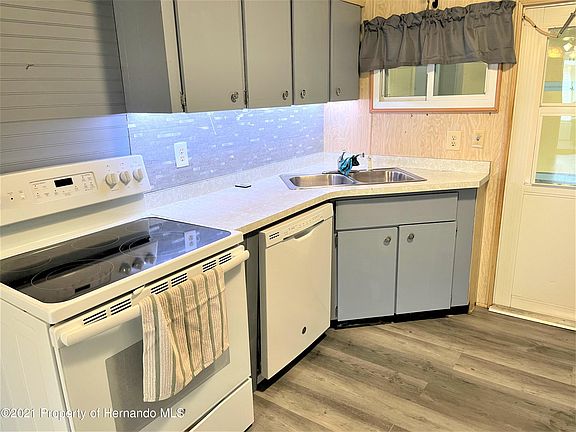 BRAND NEW AC unit this week May 25th. Upfront in community, on the golf course. Upgrades in kitchen include freshly painted cabinets and new tile backsplash. New microwave/hood combination that is available for mounting. Lovely tile shower in the master and new shower insert in guest bathroom. Newer double pained windows throughout. Some updated flooring including laminate and carpet. Screen room on rear has double doors so it can be used as storage for a golf cart. Portable A/C attached in enclosed lanai for comfort. Partially furnished. Home resides in a 55+ retirement golf community where you own your own land. Community pool, clubhouse with many activities to enjoy. Near restaurants, shopping, and the Suncoast Parkway.