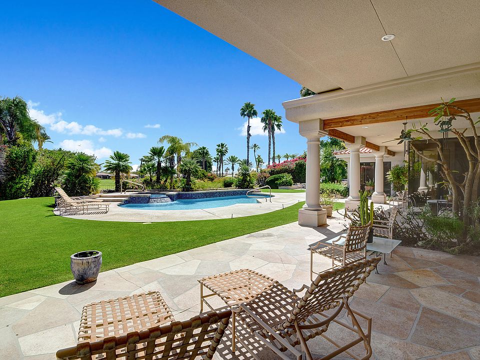 CLEAN 'N BRITE FAIRWAY ESTATES POOL HOME. Premium sized lot and double wide fairway view location in the prestigious Mission Hills Country Club. VAULTED BEAMED CEILINGS create an OPEN FEEL that expands from your first step in the Entry throughout the Living Areas. Family Great Room features 2nd fireplace, wall of glass and steps out to your own private desert playground. Plenty of covered and open patio space to enjoy Swimmer's Pool, lush lawns and fairway views! Travertine and wood flooring, expanded Master Suite with office/sitting area, generous walk-in closet, 2nd Zone AC. NOTE the complete separation of three sleeping areas, perfect for family and guests. Laundry Room w/ ample counter-space and storage. 3 Car Garage direct access. First time ever offered For Sale. Fee Land, not Leased. LOW HOA incl. Cable. One of 60 Coveted Fairway Estate Home on the Arnold Palmer Course in beautiful Rancho Mirage. Mission Hills Country Club Desert Lifestyle has Three 18-hole Championship Golf Courses, Tennis, Fitness, Croquet and Social Memberships available. Convenient 15 minutes to The River or Palm Desert Premier El Paseo Shopping & Dining District.