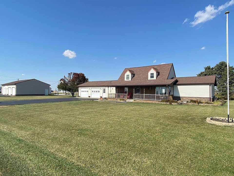UPDATED 1.5 story home situated on 1 acre and two garages. This brick and vinyl home features 3 bedrooms, 1 bath with an open layout on the main level. Spacious living room open to the dining room and access to the back deck. The kitchen is complimented with an abundance of cabinets, pantry, kitchen island, and all appliances stay. Main level master bedroom with a walk-in closet to be desired. Additional two bedrooms are located on the upper level with plenty of closet storage. Laundry room ajoins the kitchen and two car attached garage. ADDITIONAL 3 CAR detached garage is heated and cooled. Wash bay, air compressor, and half bath within the garage add convenience to this space. The exterior is complimented with a covered front porch, rear deck for entertaining, and a round patio with fire pit. This property is a dream and waiting for you!