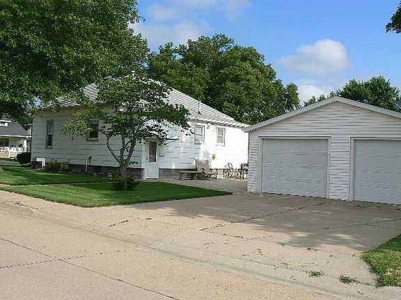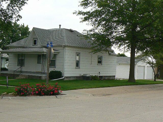 1 story frame 2 bedroom home located on corner w/concrete paving. Home has front covered front porch. Main floor: Kitchen /w dining area, Living rm, 2 bedrooms Full Bath and utility(Laundry) rm. Bull basement w/rec. room, 3/4 bath and noncompliant(no egress window) bedroom. Large patio & 2 Car detached garage. Take a Look!!
