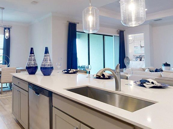 Welcome to Timbers at Everlands ~ Palm Bay's Newest 55+ Community. This Water view privately situated single-story home includes three bedrooms and a DEN/FLEX SPACE. The owner's suite boasts his and her walk-in closet, large shower, double vanities, and luxurious soaker tub. The open concept home features Grey Shaker Style Cabinets in the kitchen with a LARGE quartz island and ''Wood Plank'' Tile Flooring THROUGHOUT the home. NO CARPET ANYWHERE! Crown molding in the MLA adds an upgraded touch, PLUS Blinds on the Windows! A covered Lanai for indoor/outdoor entertaining on those breezy Florida evenings. On the exterior - IMPACT WINDOWS, Gutters, and paver driveway/porches. The community will feature a state-of-the-art clubhouse w/ fitness center, pool, tennis and pickle ball courts, bocce ball, putting greens, fishing piers, and so much more!! Be sure to ask a new home consultant about our Builder Incentives!!