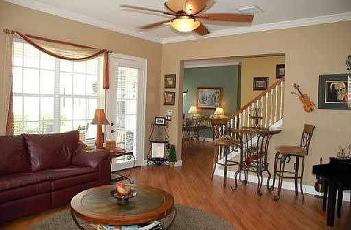 The ONLY ONE OF ITS KIND currently on market, BLOCK CONSTRUCTION, INTERNAL END UNIT w/1st FLR MASTER SUITE, Features GRANITE countertops, 42'' Maple Cabinets, Wood Flrs, SECONDARY XL BEDROOMS and MUCH MORE! CROWN MOLDING THROUGHOUT this well maintained Townhome. LARGE SIDE YARD provides personal outdoor enjoyment! Attached OVERSIZED 2 Car Garage with XL Parking Pad allows for plenty of parking needs, with attached breezeway providing coverage from the garage to the townhome! Conventiently located wi thin walking distance to the South Village Community Pool, Open Field, Children's Playground, and Heritage Hall for outdoor community enjoyment! Centrally located, with all Theme Parks, Golf Courses, and Beaches within driving distance of this Master Planned Neo Traditional Community!